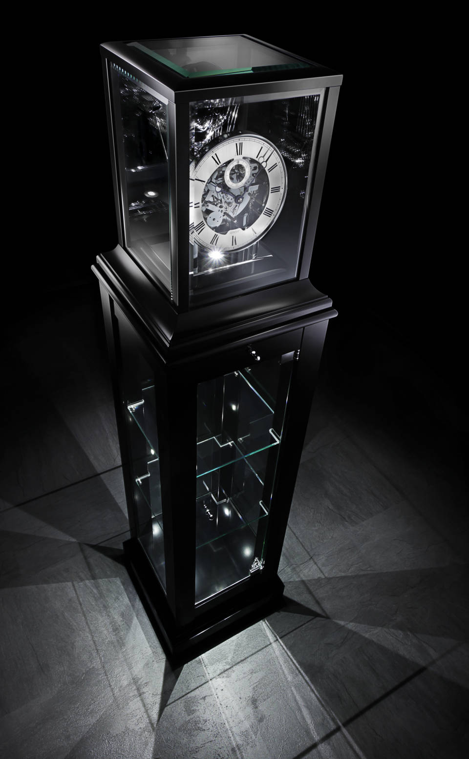 Kappkell AURORA  196 x 37,5 x 18 cm õhuke, elegantne disain puujuure struktuuriga hall vineer ja must piano-viimistlus bevelleeritud klaasid võtmesahtel 27 cm numbrilaud ja Breguet-osutid kroomitud ja poleeritud pendel ja kellapommid Westminster kellamäng automaatne öine vaikus Hind  8 990,00 EUR