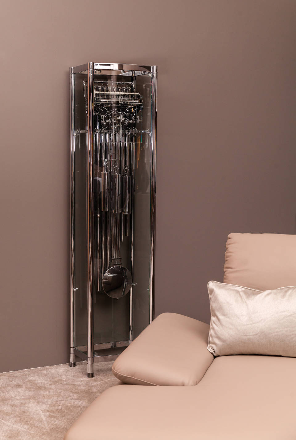 Kappkell  201 x 38 x 29 cm kaasaegne disain, ameerika pähklipuu (võimalik ka must piano-lakk) LED-valgustus kapis pool- ja täistunni löögid kalender ja kuufaaside näit pikedatud pendel, kroomitud teras Hind  10 900,00 EUR