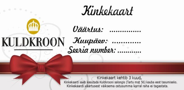 Kinkekaarti saab kasutada Kuldkrooni salongis (Rävala pst 6) kauba eest tasumiseks.